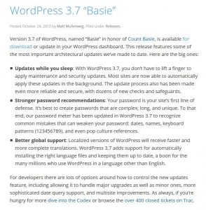 2013년 10월 24일 워드프레스 3.7 Basie 가 공식적으로 출시 되었습니다. 이번 코드명인 Basie는 Count Basie 에서 따온 것이라고 합니다. 워드프레스 3.7 버전에 추가된 주요 특징을 간략히 살펴보면 다음과 같습니다. 자동 백그라운드 업데이트