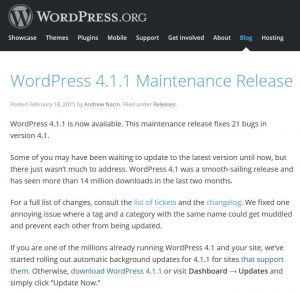 2015년 2월 18일 워드프레스 4.1.1 Maintenance가 공식적으로 출시 되었습니다. 이번 출시는 워드프레스 4.1 버전에서 발견된 21 버그를 고친 것이라고 합니다. 자세한 내용은 다음 글에서 확인할 수 있습니다. https://wordpress.org/news/2015/02/wordpress-4-1-1/